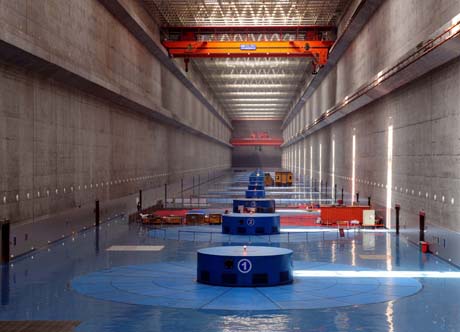 這是三峽電站左岸電廠內景(5月21日攝)。 據介紹,至5月中旬,三峽電站連續(xù)安全穩(wěn)定運行已超過1000天,標志著我國大型水電站機組制造和運行管理水平躍上新臺階。三峽電站初步設計共安裝26臺單機容量為70萬千瓦的巨型發(fā)電機組,其中有8臺為國產化機組。目前,26臺機組已全部投產發(fā)電,使三峽電站的巨大效益得到充分發(fā)揮。