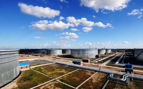 大慶油田南三油庫(kù)的油罐群和輸油管線。 中國(guó)石油大慶油田目前正在實(shí)施一項(xiàng)新的提高儲(chǔ)能計(jì)劃,預(yù)計(jì)到2010年年底前將建成8座15萬立方米石油油罐。按照這一計(jì)劃,大慶油田原油儲(chǔ)備能力將提高100余萬噸,達(dá)到300余萬噸。