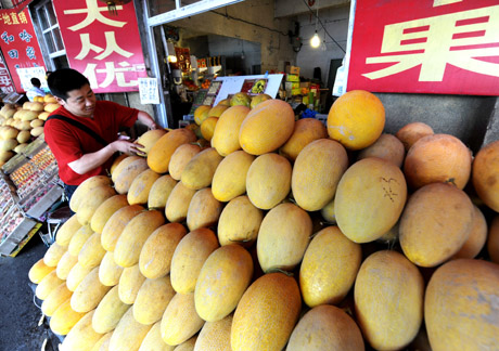 7月13日,一名水果商販在烏魯木齊北園春農(nóng)產(chǎn)品中心批發(fā)市場(chǎng)擺放哈密瓜。 目前正值新疆烏魯木齊各種時(shí)令水果消費(fèi)旺季,當(dāng)?shù)剞r(nóng)業(yè)部門(mén)從吐魯番、葉城、石河子等地組織大量西瓜、哈密瓜、杏、葡萄等水果投放市場(chǎng),受到市民歡迎。