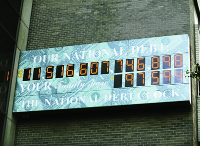 這是2009年7月13日在美國(guó)紐約市中心拍攝的聯(lián)邦財(cái)政赤字計(jì)數(shù)牌。美國(guó)財(cái)政部當(dāng)天公布的數(shù)據(jù)顯示,在截至6月30日的2008-2009財(cái)政年度的前9個(gè)月,美國(guó)聯(lián)邦財(cái)政赤字首次超過(guò)1萬(wàn)億美元。