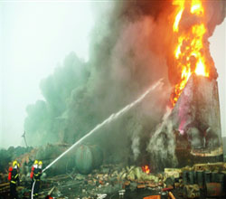 7月15日中午,消防隊(duì)員在河南偃師化工廠爆炸現(xiàn)場進(jìn)行搶險(xiǎn)救援。當(dāng)日凌晨2時(shí)許,河南偃師市洛染股份有限公司發(fā)生爆炸并起火燃燒,百余人不同程度受傷,目前已知有5人死亡,2人下落不明。明火已被撲滅。現(xiàn)場周邊千米以內(nèi)的居民和可能受影響的群眾都被疏散。