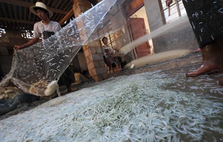 7月18日,經(jīng)過近10個月的封湖禁漁后,云南滇池開湖捕魚,周邊漁民一大早就外出捕魚,收獲頗豐。圖為滇池邊西華街村的漁民收獲銀魚。