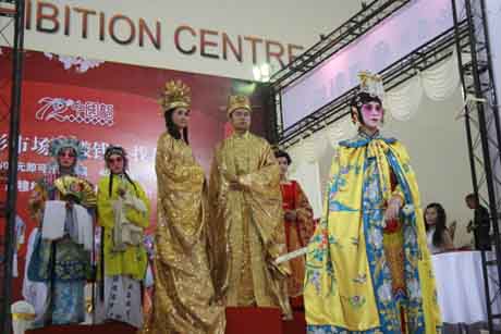 本次婚博會(huì)吸引了近千家展商云集北京展覽館內(nèi),展商各顯神通,拿出自己的最新宣傳手段吸引前來(lái)參觀的人們。當(dāng)《夜宴》、《滿城盡帶黃金甲》等影視劇中人物的扮相出現(xiàn)于展臺(tái)時(shí),使此次婚博會(huì)變得熱鬧非凡。 |