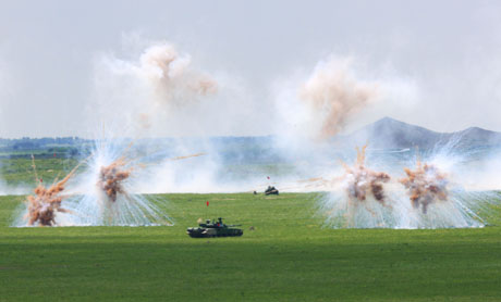 7月23日上午,中方參演裝甲戰(zhàn)車在進攻中發(fā)射電子干擾彈。 當日,中央軍委委員、中國人民解放軍總參謀長陳炳德上將、俄羅斯聯(lián)邦國防部第一副部長兼武裝力量總參謀長馬卡羅夫大將,在沈陽軍區(qū)洮南合同戰(zhàn)術訓練基地共同觀看了中俄聯(lián)合軍演,并在野營村與參演官兵共進午餐。