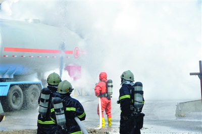 8月5日,赤峰市紅山區(qū)公安消防大隊(duì)?wèi)?zhàn)士正在對(duì)發(fā)生氨氣泄漏的事故車(chē)輛進(jìn)行降溫稀釋?zhuān)刂瓢睔鈸]發(fā)。
