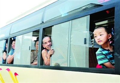8月16日,移民們在大客車上打開車窗,看看自己的新家。 當日,河南省南水北調丹江口庫區(qū)試點移民搬遷啟動儀式在許昌縣榆林鄉(xiāng)姬營移民新村舉行,首批71戶、253名村民從淅川縣搬入姬營移民新村的新居。據(jù)介紹,南水北調中線工程河南需要搬遷安置丹江口庫區(qū)農(nóng)村移民16.2萬人,建設移民新村253個,首批試點為10個移民新村,1萬余人,除姬營移民新村外,其余9個移民新村都將在9月10日前搬遷完畢。