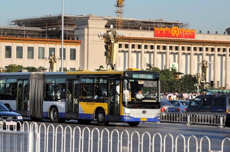 8月27日,一輛公交汽車在北京長(zhǎng)安街上行駛。為保障8月29日天安門廣場(chǎng)國(guó)慶演練活動(dòng)的順利進(jìn)行,從8月28日夜間起,北京市部分公交、地鐵線路將根據(jù)交通管制情況,適時(shí)調(diào)整運(yùn)營(yíng)方案。其中,沿線公交線路將甩站繞行,地鐵將采取提前收車、局部封站等措施。