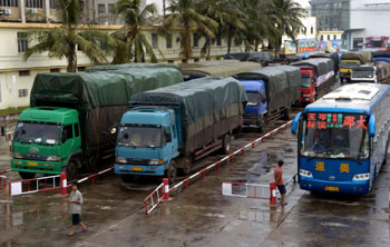 9月14日,車倆滯留在?诟鄣却龔(fù)航。當(dāng)日,2009年第15號熱帶風(fēng)暴“巨爵”逐漸向廣東沿?拷芷溆绊,海南四周海面刮起大風(fēng),?诤J戮16時(shí)30分下達(dá)指令,瓊州海峽全線停航。