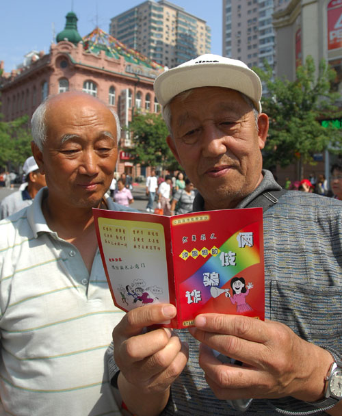 日前,哈爾濱市老齡委,哈爾濱市公安局,哈爾濱市工商局針對“冰城”老年人共同開展防范詐騙術(shù)維權(quán)宣講活動。三部門組成的宣講小分隊將從現(xiàn)在起至11月末,利用三個月時間對老年人進行揭露、預(yù)防詐騙術(shù)宣講活動,維護老年人的合法權(quán)益。圖為哈爾濱市兩位老人在研讀維權(quán)宣傳冊。