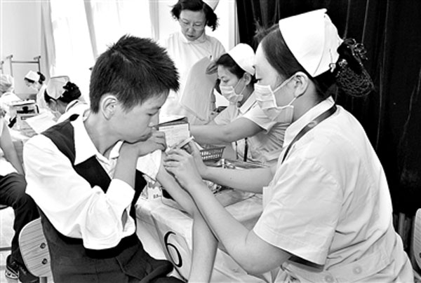 9月21日,京源學(xué)校的學(xué)生在接種甲型H1N1流感疫苗。 從當(dāng)日起,北京市在全國率先啟動甲型H1N1流感疫苗接種工作,按照不同人群疫苗接種的優(yōu)先次序,北京市目前優(yōu)先對參與國慶慶典活動的學(xué)生開展接種。新華社發(fā)