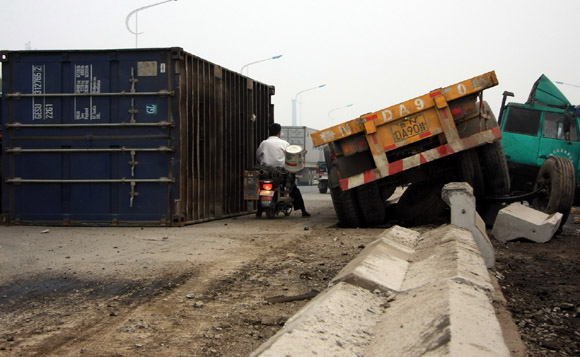 集裝箱車“跨護(hù)欄”“玩懸”