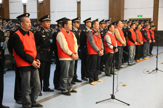 10月12日,楊天慶(左一)等被告人在庭審現(xiàn)場。 當(dāng)日,重慶兩起“涉黑涉惡”案件分別在重慶市第一和第三中級(jí)人民法院開庭,31名被告人受審。其中重慶市第一中級(jí)人民法院公開開庭審理的是楊天慶等9人“涉黑”案,國家公訴機(jī)關(guān)指控的涉案罪名多達(dá)十項(xiàng),涉嫌犯罪時(shí)間跨越八年。從當(dāng)日起,重慶的“涉黑涉惡”案件將在五個(gè)中級(jí)法院陸續(xù)開庭審理。新華社發(fā)