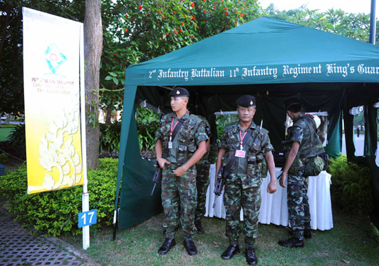 20日,士兵在位于泰國中部城市華欣的第15屆東盟峰會會場執(zhí)勤。第15屆東南亞國家聯(lián)盟(東盟)峰會以及東盟與對話國系列峰會將于本月21日至25日在泰國中部相鄰海濱城市差安和華欣召開。泰國部署大量安全人員以確保峰會順利召開。