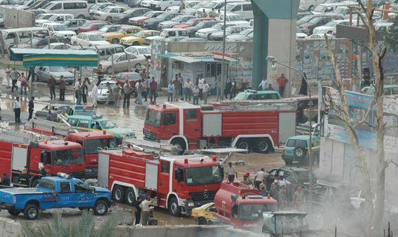 10月25日,消防車輛和伊拉克軍警趕到伊拉克首都巴格達省政府大樓前的爆炸現(xiàn)場救援。當(dāng)天,伊拉克首都巴格達市中心發(fā)生兩起汽車炸彈爆炸,接連發(fā)生的兩起汽車炸彈爆炸造成至少132人死亡、512人受傷。中國駐伊拉克使館和新華社駐巴格達分社所在的曼蘇爾飯店遭受嚴重沖擊。
