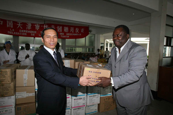 10月26日,由天津市衛(wèi)生局副局長宋立志率領(lǐng)的天津市衛(wèi)生局代表團(tuán)在加蓬首都利伯維爾代表中國政府向中加合作醫(yī)院捐贈了一批價值30萬人民幣的藥品和醫(yī)療器械。圖為昂杜院長(右一)象征性地從天津市衛(wèi)生局代表團(tuán)團(tuán)長宋立志(左一)手中接過中方捐贈的藥品。