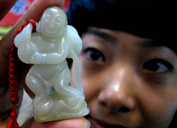 日前,由北京博古仁和拍賣有限公司首推的“大眾化星期拍賣會(huì)”在北京開槌舉行!按蟊娀瞧谂馁u會(huì)”旨在采取、推廣新拍賣理念,直接面對(duì)社會(huì)大眾提供民間書畫、瓷器、玉器和雜項(xiàng)等藝術(shù)品,每星期周三、周六拍賣兩次,采取無底價(jià)方式拍賣,達(dá)到100%成交,深受京城百姓歡迎。圖為工作人員在介紹拍品新疆和田玉雕件《劉海戲金錢》。