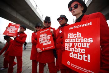 12月9日,在丹麥?zhǔn)锥几绫竟,環(huán)保人士在聯(lián)合國氣候變化大會會場外舉行活動,要求發(fā)達國家履行減排承諾,并為其歷史上過度排放、破壞環(huán)境的做法提供補償。新華社記者 謝秀棟 攝