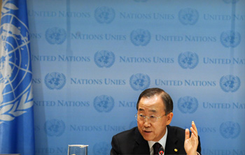 12月14日,聯(lián)合國秘書長潘基文在美國紐約聯(lián)合國總部舉行的月度新聞發(fā)布會上講話。潘基文呼吁各國加倍努力,在丹麥哥本哈根舉行的聯(lián)合國氣候變化大會上達成一個“全面、公平”的協(xié)議。新華社記者 申宏 攝