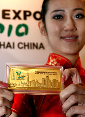1月19日,模特在展示上海世博會(huì)彩色紀(jì)念金條。 當(dāng)日,經(jīng)上海世博會(huì)事務(wù)協(xié)調(diào)局授權(quán),由中國(guó)金幣總公司發(fā)行、上海金幣投資有限公司總經(jīng)銷的中國(guó)2010年上海世博會(huì)彩色紀(jì)念金條(第2組)及彩色紀(jì)念銀條系列產(chǎn)品在上海正式發(fā)布。