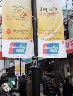 1月27日,在韓國首爾的明洞商業(yè)區(qū),人們經(jīng)過“銀聯(lián)”宣傳條幅。截至2009年12月,銀聯(lián)卡在韓國發(fā)行量已突破100萬張,韓國由此成為銀聯(lián)卡自2004年走出國門以來,首個(gè)發(fā)卡突破百萬的境外國家。