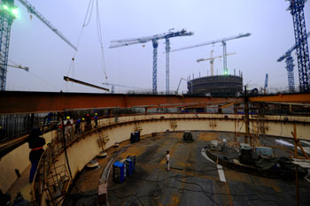 建設(shè)中的紅沿河核電站4號(hào)機(jī)組核島。作為中國(guó)東北第一座核電站——遼寧紅沿河核電站一期工程正式開(kāi)工兩年多來(lái),建設(shè)速度與質(zhì)量均衡推進(jìn),主要設(shè)備的國(guó)產(chǎn)化配套與技術(shù)創(chuàng)新等都取得了重要進(jìn)展。新華社記者 任勇/攝 |
