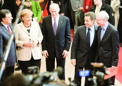 2月11日,(從左至右)歐盟委員會主席巴羅佐、德國總理默克爾、希臘總理喬治·帕潘德里歐、法國總統(tǒng)薩科齊和歐洲理事會常任主席范龍佩在比利時布魯塞爾的歐盟理事會大樓內(nèi)聊天。歐盟領(lǐng)導人11日在布魯塞爾舉行非正式會晤,重點討論希臘政府債務危機、未來10年經(jīng)濟發(fā)展戰(zhàn)略、全球應對氣候變化談判和海地災后重建。(相關(guān)報道見今日四版)新華社發(fā)