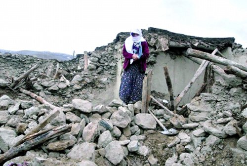 3月8日,在土耳其埃拉澤省,一名婦女站在被震毀的房子旁。 土耳其當(dāng)?shù)孛襟w8日?qǐng)?bào)道,土東部埃拉澤省當(dāng)天發(fā)生的里氏6.0級(jí)地震已造成57人死亡。