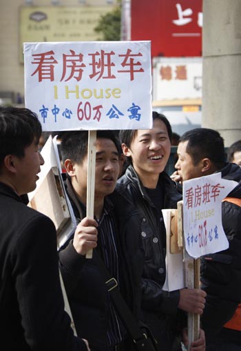 3月18日,參展房地產(chǎn)企業(yè)的工作人員在廣場上招攬看房者。 當(dāng)日,有“上海樓市風(fēng)向標(biāo)”之稱的“2010上海之春房產(chǎn)展示交易會”在上海展覽中心開幕。此次參展的國內(nèi)開發(fā)商約200家,展覽面積達(dá)2萬平方米。在2009年底以來推出的密集調(diào)控政策影響下,本屆展會首日盡管人氣不減,但市場的觀望氣氛也悄然升溫。