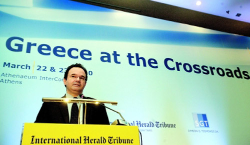 3月23日,希臘財政部長喬治·帕帕康斯坦季努在雅典舉行的“希臘在十字路口上”經(jīng)濟(jì)研討會上發(fā)言。帕帕康斯坦季努表示,希臘尋求并期待25日的歐盟首腦會議出臺針對希臘債務(wù)危機(jī)的救助方案,但這絕非乞求。新華社發(fā)