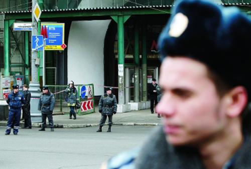 29日,在俄羅斯首都莫斯科,警察在文化公園地鐵站附近警戒。
