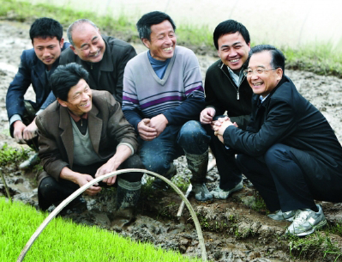 4月9日至11日,中共中央政治局常委、國(guó)務(wù)院總理溫家寶來到安徽蚌埠、池州兩地,深入田間地頭察看苗情,走村入戶看望群眾,實(shí)地考察農(nóng)產(chǎn)品加工龍頭企業(yè)和治淮工程現(xiàn)場(chǎng),召開座談會(huì)聽取基層干部群眾的建議。 這是4月10日,溫家寶在池州市貴池區(qū)梅龍鎮(zhèn)和當(dāng)?shù)剞r(nóng)民一起察看早稻育秧情況。