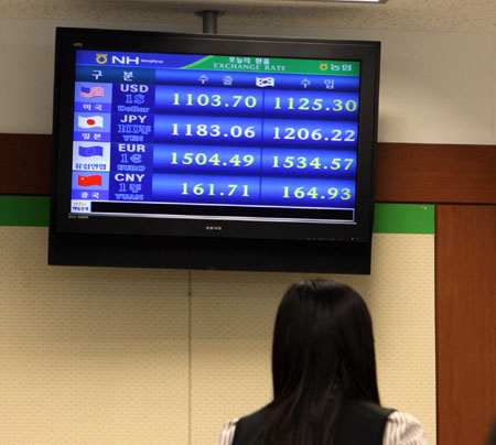 12日,韓國首爾一家銀行的工作人員查看匯率牌價(jià)。 截至當(dāng)日上午9時(shí)19分,首爾外匯市場(chǎng)韓元匯率為1美元兌換1111.80韓元,較前一個(gè)交易日上漲6.4韓元。這是自2008年9月12日以來,韓元兌美元匯率的最高值。