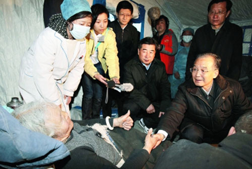 4月15日,中共中央政治局常委、國務(wù)院總理溫家寶乘專機抵達(dá)青海玉樹巴塘機場。隨即乘車前往地震災(zāi)區(qū),察看災(zāi)情,看望慰問災(zāi)區(qū)群眾,指導(dǎo)抗震救災(zāi)工作。 這是溫家寶在玉樹地震災(zāi)區(qū)看望慰問災(zāi)區(qū)群眾時,一位藏族老阿媽雙手豎起大拇指感謝共產(chǎn)黨。