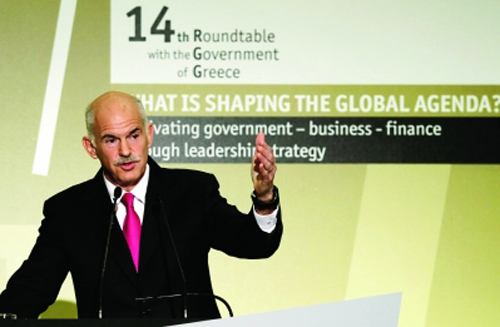 4月28日,在希臘首都雅典,希臘總理帕潘德里歐在《經(jīng)濟(jì)學(xué)人》雜志舉辦的一次研討會(huì)上發(fā)表演講。帕潘德里歐當(dāng)日呼吁進(jìn)行全球金融監(jiān)督管理,以應(yīng)對(duì)已從希臘蔓延到歐元區(qū)其他成員國(guó)的嚴(yán)重經(jīng)濟(jì)危機(jī)。新華社發(fā)
