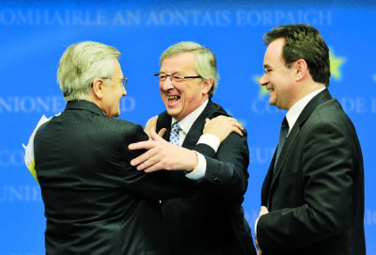 5月2日,在比利時(shí)首都布魯塞爾舉行的歐元區(qū)成員國(guó)財(cái)政部長(zhǎng)會(huì)議后的新聞發(fā)布會(huì)上,歐元集團(tuán)主席、盧森堡首相容克(中)擁抱歐洲央行行長(zhǎng)特里謝(左),希臘財(cái)政部長(zhǎng)帕帕康斯坦季努站在一旁。當(dāng)天,歐元區(qū)財(cái)政部長(zhǎng)同意在未來(lái)的三年內(nèi)為希臘政府提供800億歐元貸款,以幫助陷入債務(wù)危機(jī)的希臘渡過(guò)難關(guān)。(詳見(jiàn)今日四版) |