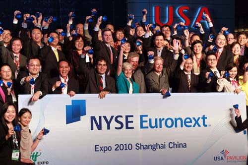 5月20日北京時間21點30分(美國東部時間上午9點30分),美國紐約泛歐交易所集團高管與紐約證券交易所部分上市公司代表在上海世博園美國館前搖響小鐘,為紐約證券交易所遠程開市。當(dāng)日,美國紐約證券交易所在上海世博園美國館和位于紐約的交易所交易大廳內(nèi)同步舉行開市儀式!