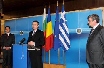 5月21日,羅馬尼亞外長巴孔斯基(右)、希臘代外長茲魯察斯(中)和保加利亞外長姆拉德諾夫在羅馬尼亞首都布加勒斯特出席記者招待會。當天,三國外長在布加勒斯特舉行會晤,主要討論共同應(yīng)對當前經(jīng)濟危機、加強地區(qū)各領(lǐng)域合作等問題。新華社記者