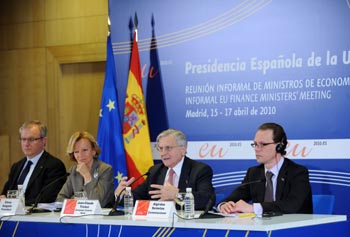在4月召開的歐盟財長非正式會議上,有關各方曾就開征銀行稅等問題協(xié)調(diào)歐盟內(nèi)部立場。圖為當時歐洲央行行長特里謝(右二)出席歐盟財長非正式會議記者招待會。新華社記者 陳海通 攝