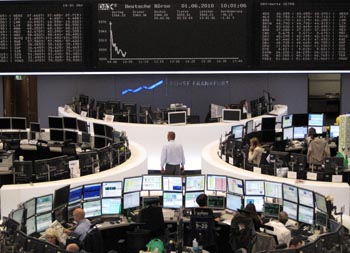6月1日,交易人員在德國法蘭克福證券交易所工作。 受英國石油公司股價大跌、歐洲制造業(yè)表現(xiàn)疲軟以及歐洲中央銀行宣布?xì)W洲銀行可能面臨更多資產(chǎn)減記等利空因素沖擊,歐洲股市主要股指1日開盤后全線大幅下跌。截至倫敦時間1日上午9點30分左右,泛歐600種股票指數(shù)下跌1.6%至241.16點,創(chuàng)一年多來最大月度跌幅。