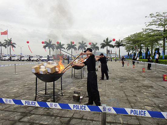 | 海關(guān)總署25日上午在廣東虎門舉行儀式,銷毀全國海關(guān)近年來查獲的上噸走私毒品。圖為海關(guān)關(guān)員執(zhí)行銷毀毒品的點火任務(wù)。 |