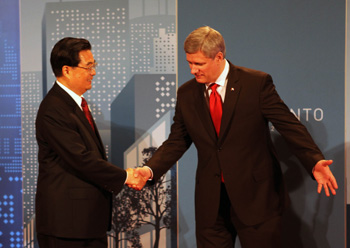 6月26日,中國國家主席胡錦濤在多倫多出席加拿大總理斯蒂芬·哈珀舉行的二十國集團(tuán)領(lǐng)導(dǎo)人工作晚宴。 這是斯蒂芬·哈珀在多倫多皇家約克飯店迎接胡錦濤。新華社記者