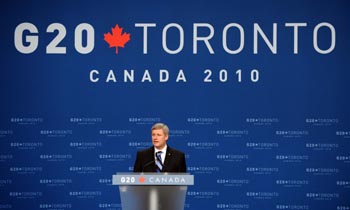 6月27日,在加拿大多倫多會(huì)議中心,加拿大總理哈珀在二十國(guó)集團(tuán)首腦會(huì)議閉幕新聞發(fā)布會(huì)上講話。第四次二十國(guó)集團(tuán)峰會(huì)當(dāng)天在多倫多閉幕,會(huì)議發(fā)表了《二十國(guó)集團(tuán)多倫多峰會(huì)宣言》。新華社記者