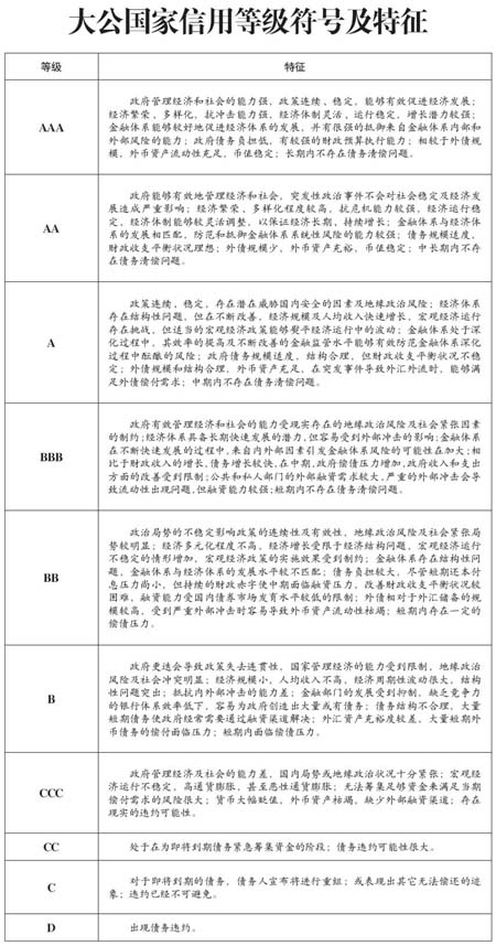 根據(jù)確定的影響國家信用風(fēng)險(xiǎn)五大關(guān)鍵評(píng)級(jí)要素及能夠刻畫這些要素的具體指標(biāo),大公建立了國家信用評(píng)級(jí)操作系統(tǒng)。錄入指標(biāo)數(shù)據(jù),依據(jù)設(shè)定的評(píng)分方法和評(píng)分標(biāo)準(zhǔn),系統(tǒng)會(huì)產(chǎn)生初始信用等級(jí),之后經(jīng)過信用評(píng)審委員會(huì)的調(diào)整形成最終的本、外幣國家信用等級(jí)。其具體思路和步驟如下: 第一步,分別確定國家管理能力、經(jīng)濟(jì)實(shí)力、金融實(shí)力、財(cái)政實(shí)力及外匯實(shí)力的信用分值。 以國家管理能力為例,首先對(duì)其中的各項(xiàng)指標(biāo)進(jìn)行模型量化處理,接下來將得分加權(quán)平均,得到一國國家管理能力的最初得分,之后評(píng)審會(huì)會(huì)綜合考慮在模型中沒有體現(xiàn)的該國在國家管理能力方面的特有優(yōu)勢(shì)或劣勢(shì),并通過國家間的比較,對(duì)初始得分進(jìn)行一定調(diào)整,最后得到該國家的最終得分。分值區(qū)間從0到9,0分代表風(fēng)險(xiǎn)最高,9分代表風(fēng)險(xiǎn)最低。 第二步,對(duì)前四大要素進(jìn)行加權(quán)平均,得到本幣信用分值,并將分值對(duì)應(yīng)為信用等級(jí)。 大公國家信用等級(jí)從高到底,從AAA到D共十個(gè)等級(jí)。除“AAA”、“C”和“D”等級(jí)外,每個(gè)信用等級(jí)可用“+”或“-”進(jìn)行微調(diào),分別表示比相應(yīng)等級(jí)的信用質(zhì)量稍高或稍低。 第三步,綜合外匯實(shí)力得分,對(duì)本幣信用等級(jí)進(jìn)行調(diào)整,得到外幣信用等級(jí)。 外匯實(shí)力很強(qiáng)的國家,外幣信用等級(jí)有可能超過本幣信用等級(jí),但在多數(shù)情況下,外幣信用等級(jí)會(huì)等于或低于本幣信用等級(jí)。 這樣,最終得到了本幣和外幣的國家信用等級(jí)。下面列出大公國家信用等級(jí)符號(hào)及相應(yīng)等級(jí)的信用風(fēng)險(xiǎn)特征。應(yīng)強(qiáng)調(diào)的是,被評(píng)定為某一信用等級(jí)的國家,并非必須滿足該信用等級(jí)相對(duì)應(yīng)的所有特征,但一般應(yīng)滿足其中多項(xiàng)特征。