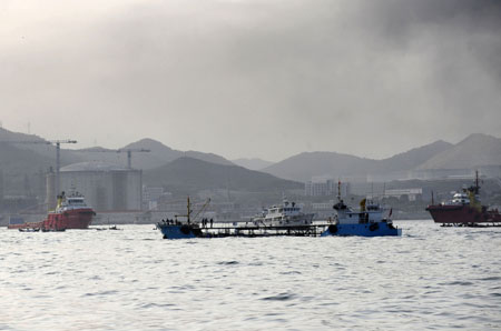 7月18日,遼寧海事局和大連有關(guān)部門把主要人力、物力投入到清除輸油管線爆炸造成的海洋污染上。截至18日15時(shí),遼寧海事局等部門出動(dòng)海事工作人員400人次,協(xié)調(diào)40多艘次船舶,車輛百余車次,在溢油海域布設(shè)圍油欄已擴(kuò)大到9000多米,清除海洋污染的作業(yè)積極有效。清理過的海域,表面污染狀況有一定改善。