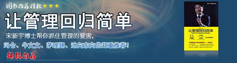 由于工作的原因,接觸到這樣一本管理書:《讓管理回歸簡單——宋新宇博士幫你抓住管理的要害》。因為是剛剛步入職場的新手,所有的一切都是從頭開始學起,所以對于管理者的角色沒有太多的概念。讓我想去翻開這本書的理由也許就是因為這個書名吸引了我,在我看來,管理是一個復雜的過程,不論是方式方法還是個人理念,都有著千差萬別,所以希望能在書中看看如何把管理回歸簡單…[詳細]
