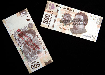 這是在墨西哥首都墨西哥城的墨西哥銀行展示的面額500比索新幣樣票(8月30日攝)。