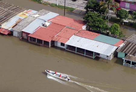 9月4日,在墨西哥韋拉克魯斯,救援人員乘沖鋒舟對洪災(zāi)地區(qū)實(shí)施救援。 當(dāng)日,韋拉克魯斯州幾個(gè)受災(zāi)嚴(yán)重城市的2萬多名居民被疏散至安全地區(qū)。墨西哥東南部地區(qū)近來持續(xù)暴雨,河流水位不斷上漲引發(fā)洪水,造成28萬人受災(zāi),另有7人死亡。