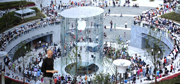 9月1日,在美國加州舊金山舉行的新產(chǎn)品發(fā)布會上,蘋果公司首席執(zhí)行官喬布斯(左下)介紹位于中國上海的蘋果產(chǎn)品零售店。當(dāng)日,蘋果公司發(fā)布新一代iPod、AppleTv等產(chǎn)品。新華社記者 戚恒/攝 |
