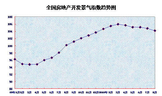 8月份,全國房地產(chǎn)開發(fā)景氣指數(shù)(簡稱“國房景氣指數(shù)”)為104.11,比7月份回落0.60點,比去年同期提高4.03點。
