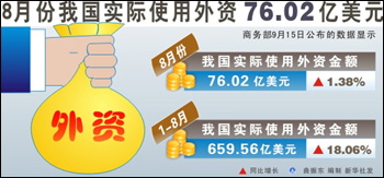 據(jù)商務(wù)部公布,2010年1至8月,全國(guó)新批設(shè)立外商投資企業(yè)16721家,同比增長(zhǎng)18.33%,實(shí)際使用外資金額659.56億美元,同比增長(zhǎng)18.06%!督(jīng)濟(jì)參考報(bào)》記者注意到,從今年3月以來,我國(guó)吸收外資金額一直保持著兩位數(shù)的高速增長(zhǎng),8月同比增長(zhǎng)1.38%為近6個(gè)月來的最低增幅,僅稍高于存在春節(jié)因素的2月。